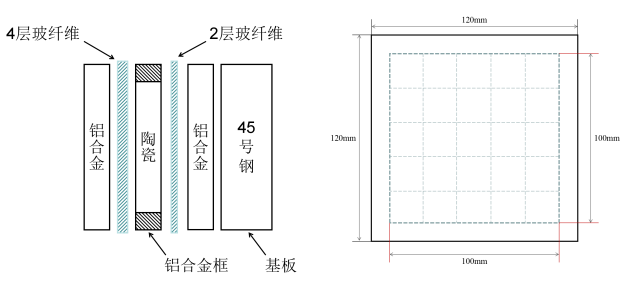 靶板從左到右依次為鋁合金面板、4層玻纖布、鋁合金邊框及陶瓷片、2層玻纖布、鋁合金背板、45號(hào)鋼基板。采用鋁合金邊框?qū)μ沾蓧K進(jìn)行二維約束,再將玻纖布平鋪在陶瓷層的正面和背面(正面鋪上四層玻纖布、背面鋪上兩層玻纖布),正面與背面再用鋁合金板密封,使用聚氨酯膠黏劑將整個(gè)結(jié)構(gòu)在常溫下固化成型為復(fù)合裝甲陶瓷結(jié)構(gòu)件。