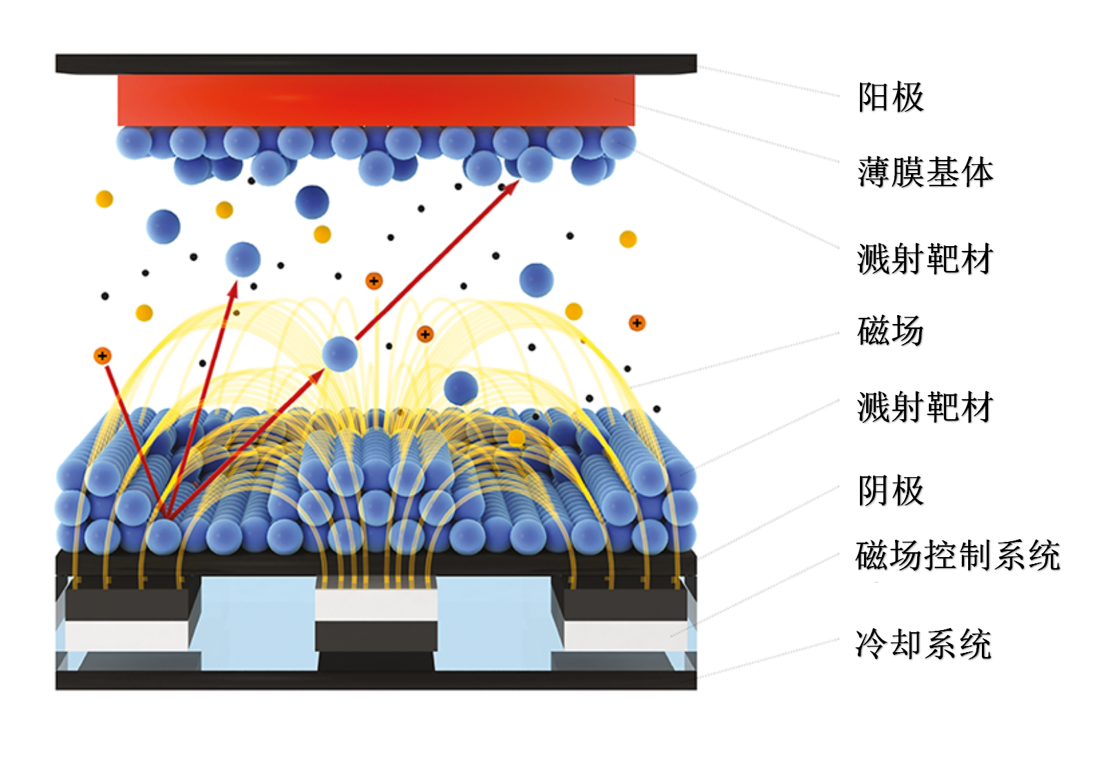 磁控濺射鍍膜工藝是指將涂層材料做為靶陰極,利用氬離子轟擊靶材,產生陰極濺射,把靶材原子濺射到工件上形成沉積層的一種鍍膜技術。