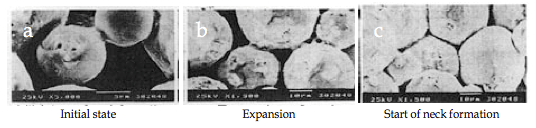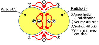 圖a顯示了由于等離子體中的火花引起的頸部形成的初始階段的行為。熱量立即從火花放電柱的中心傳遞到球體表面并擴散,使得晶間結合部分快速冷卻。如圖b所示,其顯示了幾個頸部,脈沖在顆粒之間一個接一個地引起火花放電。即使單個顆粒,隨著重復放電,在相鄰顆粒之間形成頸部的位置的數量也增加。圖c顯示了SPS燒結晶界的狀態,該燒結晶界在燒結進一步發展后發生塑性變形。