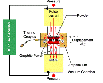 SPS工藝是一種電燒結技術,它將來自于脈沖發生器的脈沖電流施加到顆粒粉末上(見下圖),除了促進上述燒結的因素外,發生在粉末顆粒之間的有效放電,也促進了燒結。